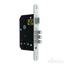 Данный цилиндровый врезной замок имеет корпус повышенной прочности и стальные ригели в количестве трех штук, диаметр каждого 12 мм и выдвижением из корпуса максимально на 24 мм. Замочный механизм оборудован защелкой. Удаленность ключевого отверстия равна 55 мм.